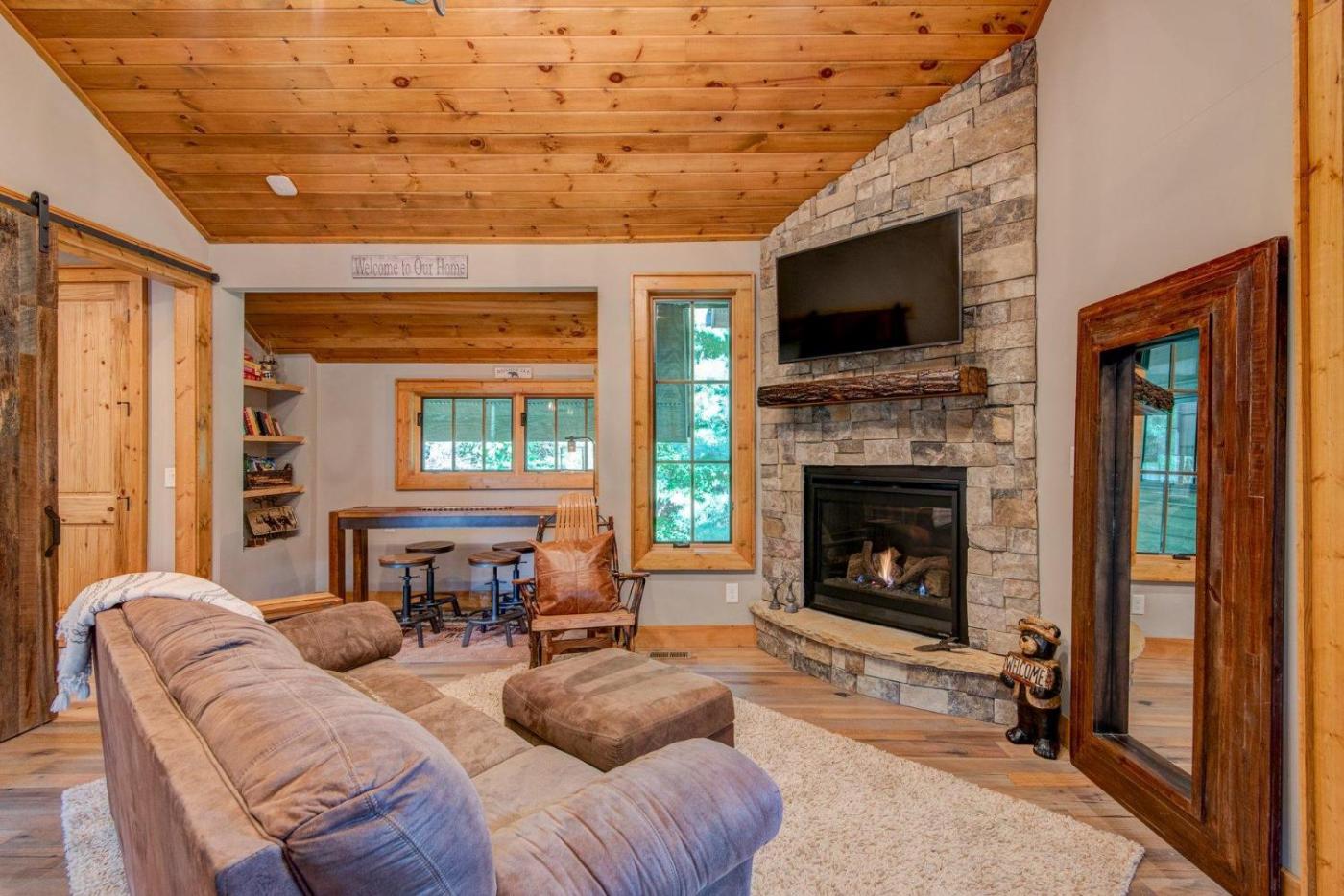 Two-Bedroom Holiday Home. The fireplace is a top feature of this holiday home. Boasting a private entrance, this air-conditioned holiday home includes 1 living room, 2 separate bedrooms and 2 bathrooms with a shower and a hairdryer. Guests will find a stovetop, a refrigerator, a dishwasher and kitchenware in the kitchen. The holiday home also features a barbecue. The holiday home offers a flat-screen TV with satellite channels, a washing machine, a tea and coffee maker, a seating area as well as mountain views. The unit has 3 beds.