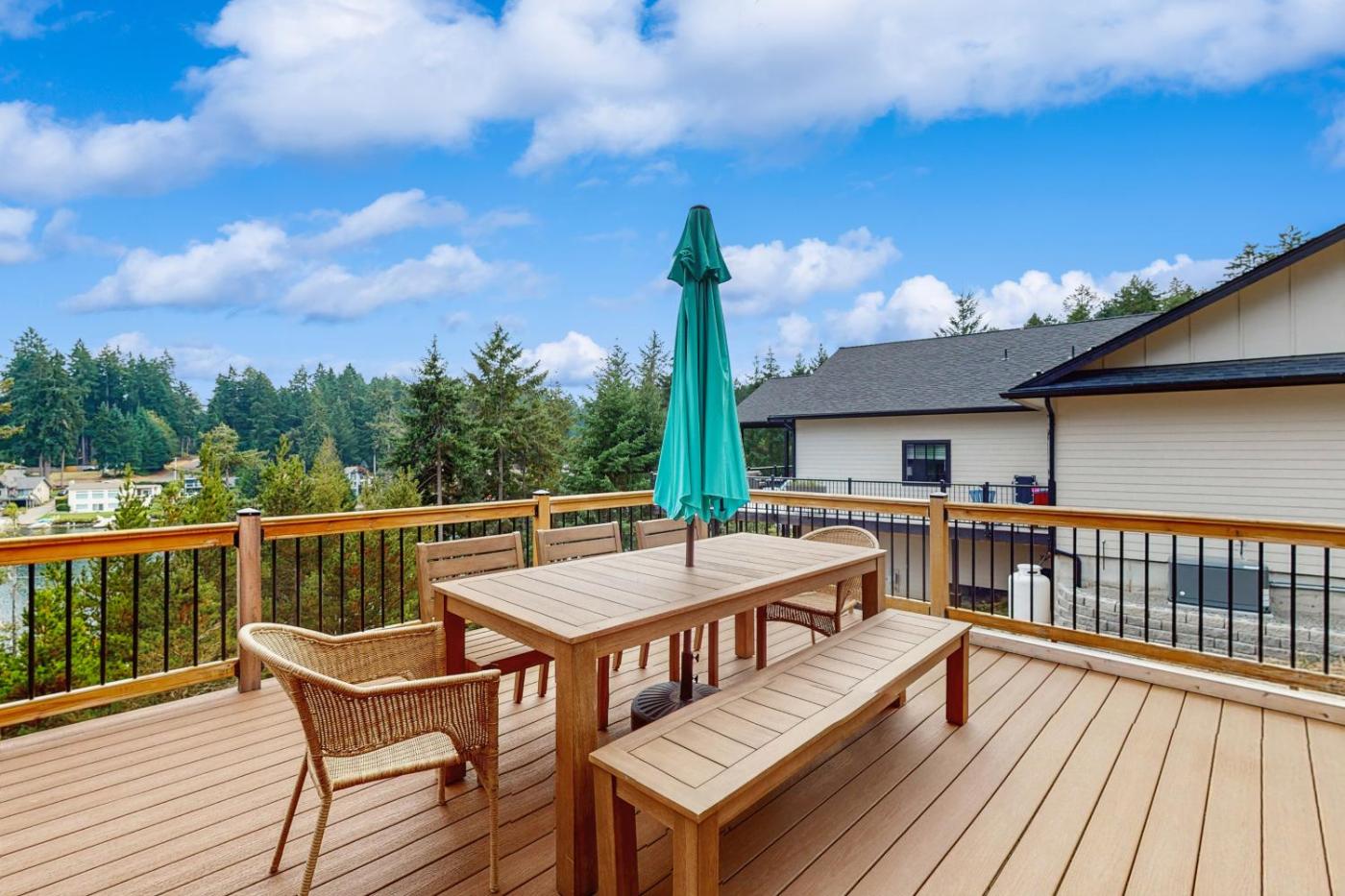 The spacious holiday home features 4 bedrooms, 3 bathrooms, bed linen, towels, a flat-screen TV, a fully equipped kitchen, and a patio with lake views. There is also a seating area and a fireplace.