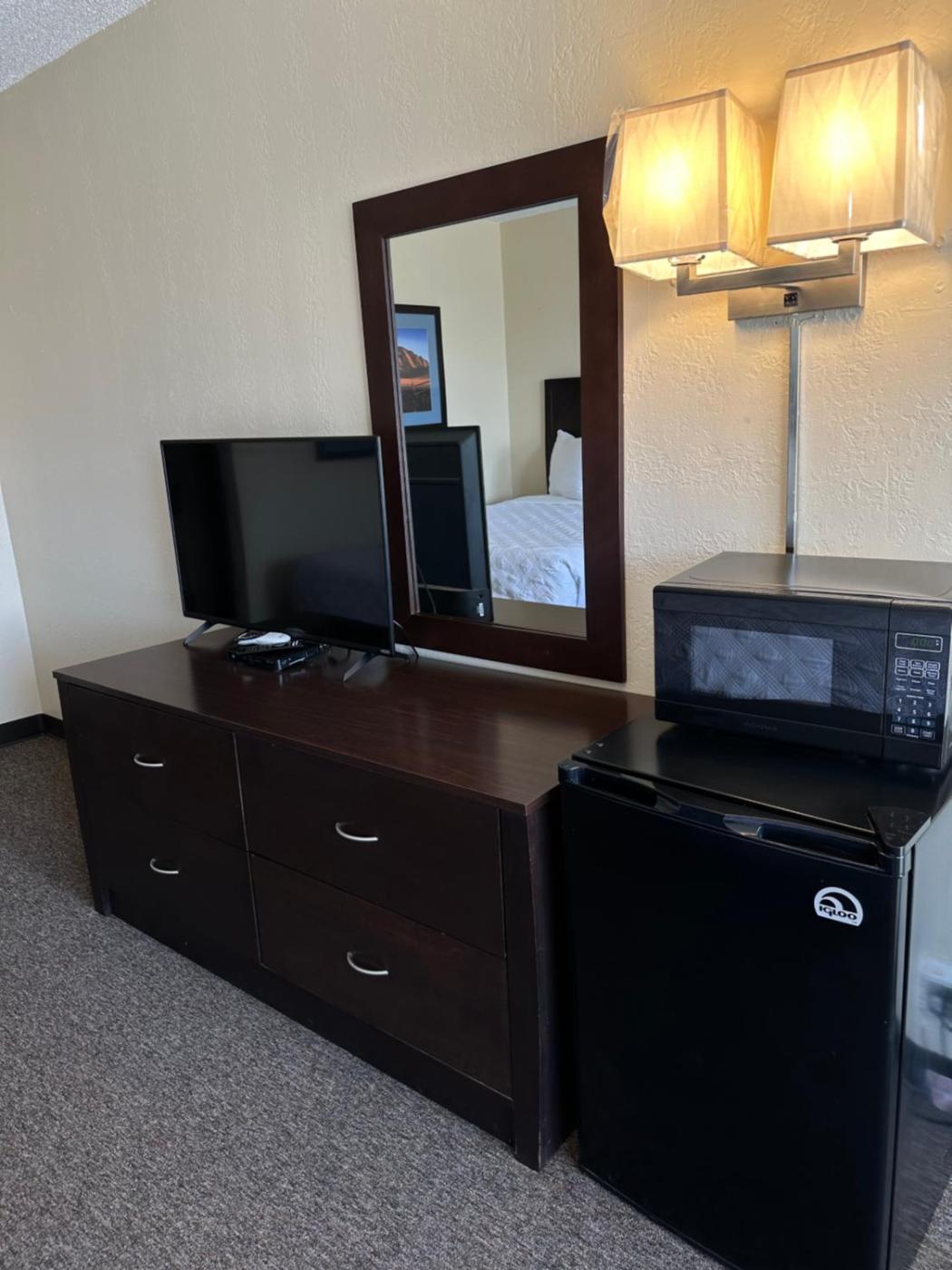 At the motel, the rooms come with a desk and a flat-screen TV.