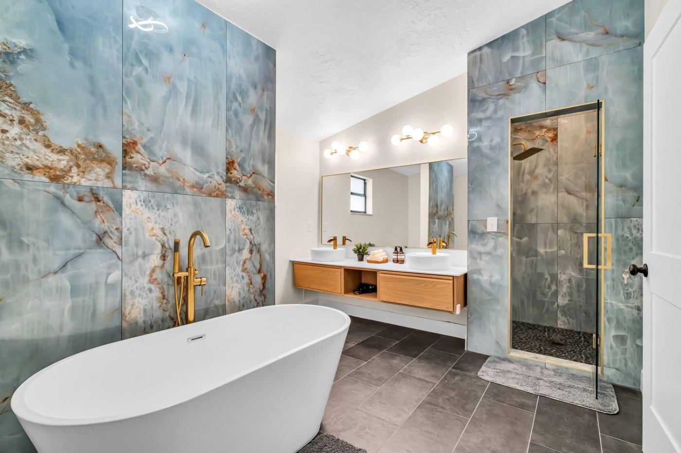 The air-conditioned holiday home is composed of 5 separate bedrooms, a fully equipped kitchen with a dishwasher and an oven, and 5 bathrooms. For added privacy, the accommodation features a private entrance.