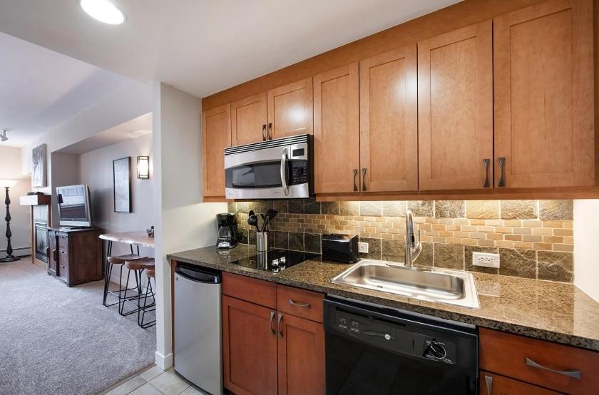 Studio Apartment. This apartment offers a fireplace. This apartment includes a kitchenette, a seating area, 1 separate bedroom and 1 bathroom with a bath and a shower. Guests can make meals in the kitchenette that has a refrigerator, a dishwasher, kitchenware and a microwave. This apartment has a tea and coffee maker, a dining area and a flat-screen TV with cable channels. The unit has 2 beds.